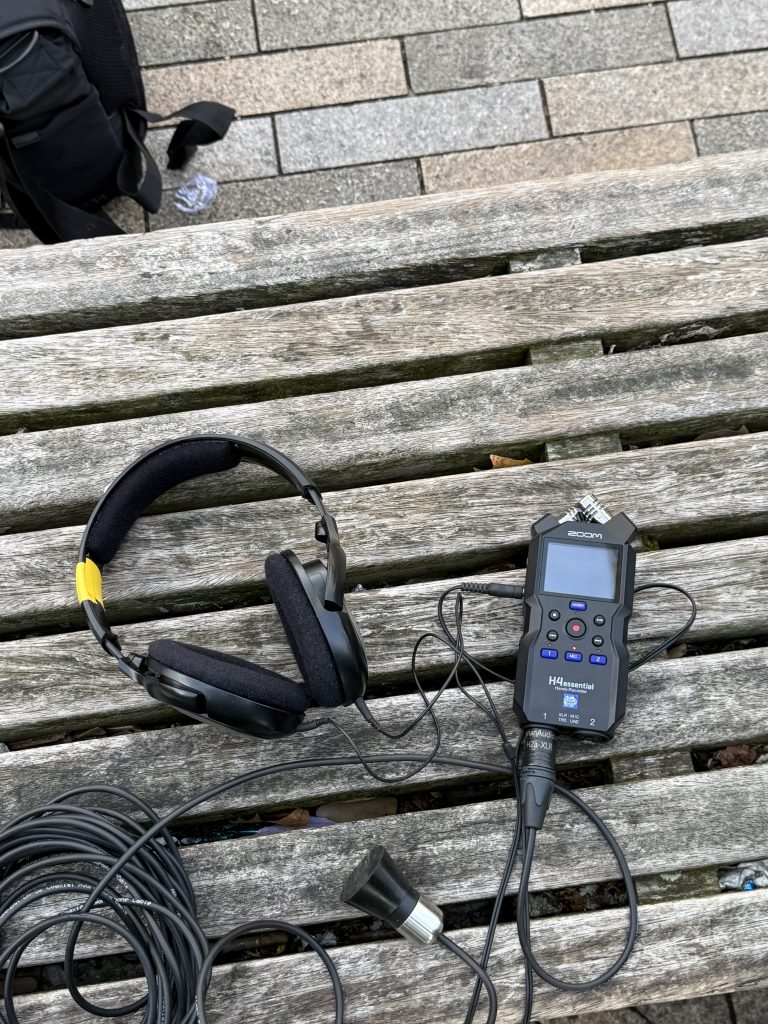This Monday, we did a sound experiment at Elephant Fort Center. We used a hydrophone to record sounds at the fountain, and we also made a sound map by listening and writing down what we heard.