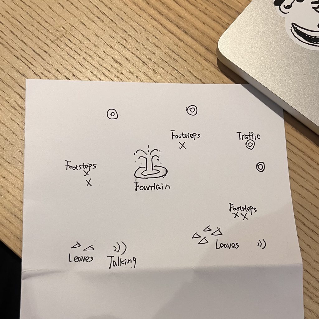 After that, we made a sound map through listening and taking notes. In the map, the fountain was the main sound in the center. Around it were footsteps, traffic noise, the sound of leaves moving, and some voices from people. The map helped us see how different sounds are spread out in space.