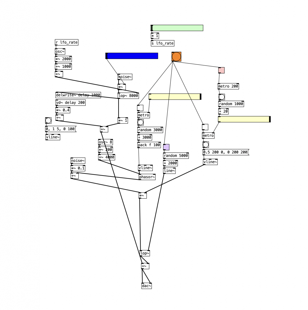 I started by designing the system on the Pure Data side. My idea was to create a small sound engine that can simulate natural sounds, so the noise box would not only produce abstract noise, but also create layers, rhythm, and variation like a natural environment.